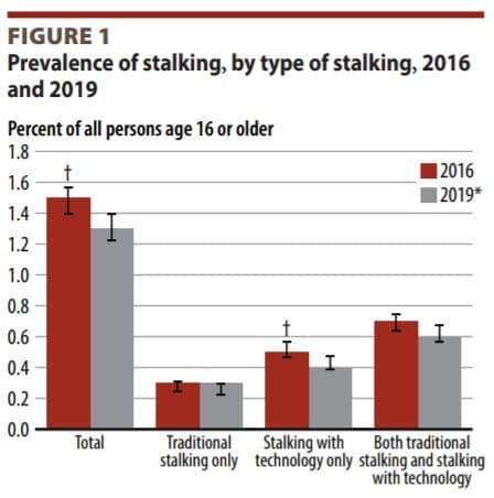 An estimated 3.4 million U.S. residents aged 16 or older were victims of stalking in 2019, the Bureau of Justice Statistics (BJS) said in its Stalking Victimization report published this month. That estimated number amounts to around 1.3% of all U.S. residents aged or older falling prey to stalking in 2019, the latest year for which the BJS has data available. Statistically, 2019’s 1.3% is a significant decrease from 2016’s 1.5%, the BJS said.