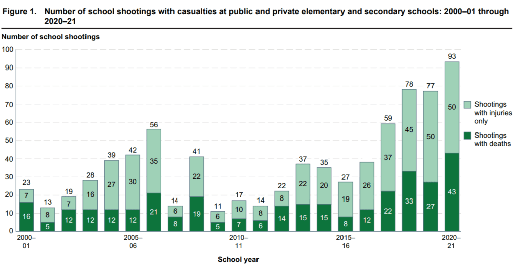 • Between 2000–01 and 2020–21, the number of school shootings with casualties per year at public and private elementary and secondary schools ranged from 11 to 93. The 93 school shootings in 2020-21, which we mentioned at the beginning of this piece, includes 43 school shootings with deaths and 50 school shootings with injuries only.