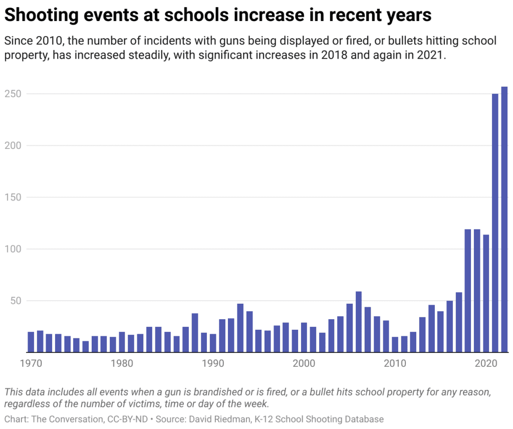 It’s little wonder then that the numbers are also showing a spike in incidents of gunfire at campuses. Let’s start by looking at data from The Conversation, a not-for-profit media outlet whose criminologists have built a database to log all school shootings in the U.S. Their numbers show that 2022 is the worst year on record for school shootings. “As of Oct. 24, there have been 257 shootings on school campuses,” per The Conversation.